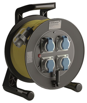 Spezialgummi-Kabeltrommel mit 4 druckwasserdichten Schutzkontakt- Anbausteckdosen 2-polig + E, 16A, 250V mit Bajonettverschluss, geeignet fuer den Nassbereich inklusive druckwasserdichtem Stecker am Kabelende mit 50 m Kabel H07BQ-F 3x2,5 Kabelfarbe gelb (auf Wunsch individueller Aufdruck ohne Aufpreis)