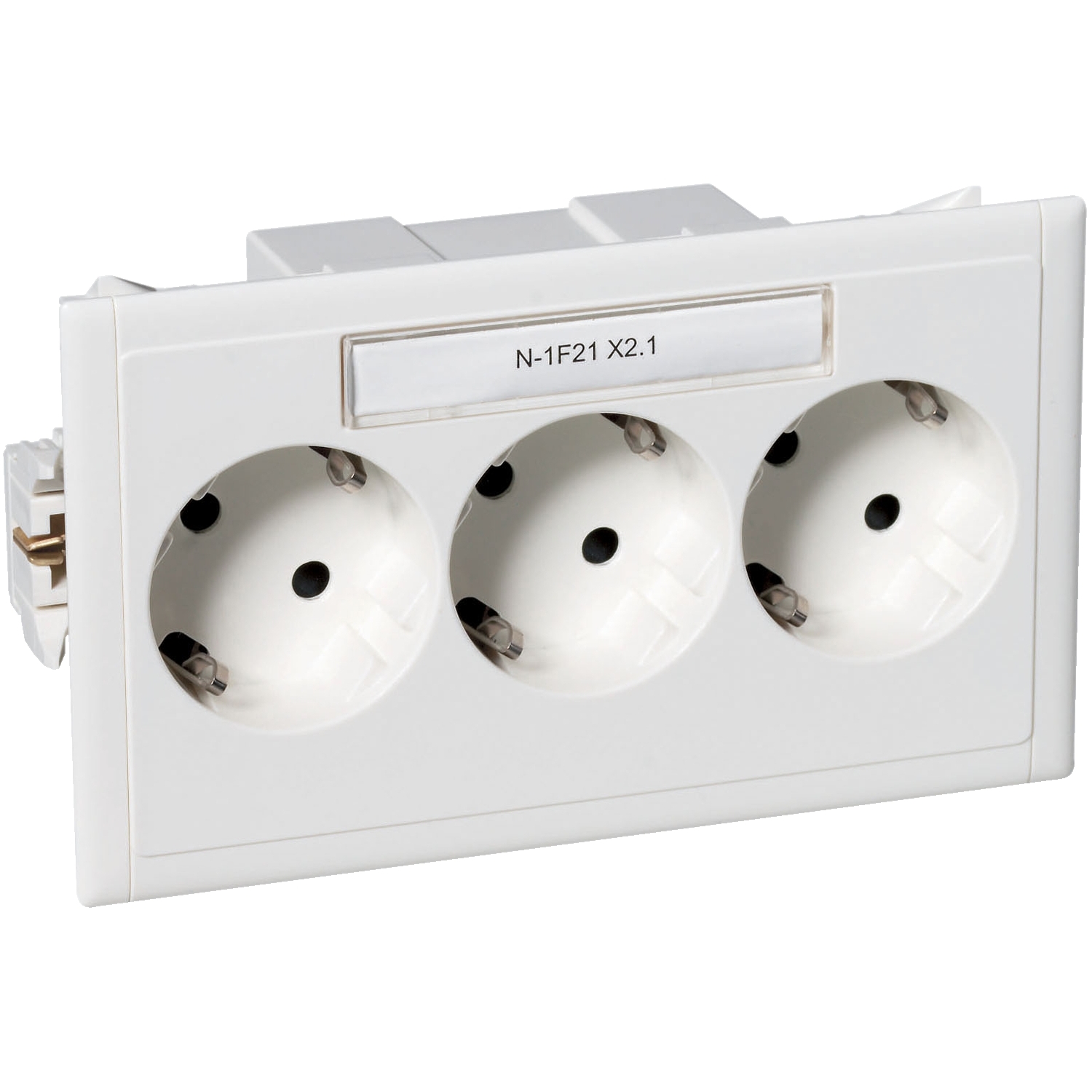 Thorsman - CYB-PS - Steckdose - dreifacher Master - 37° - weiß NCS. Alle CYB-steckdosen verfügen über einen erhöhten Berührungsschutz. Die Master- und Slave-Steckdosen werden ohne Dose eingebaut. Dieses System besteht aus einer Dreifach-Master-Steckdose, die mit einer beliebigen Anzahl von Zweifach-Slave-Steckdosen erweitert werden kann. Die Kombination wird mit einem Endstück abgeschlossen, das einfach zwischen die Seite der Steckdose und die Frontabdeckung eingesteckt wird. Kennzeichnung, Abschluss und Zugentlastung werden an der Mastersteckdose vorgenommen.