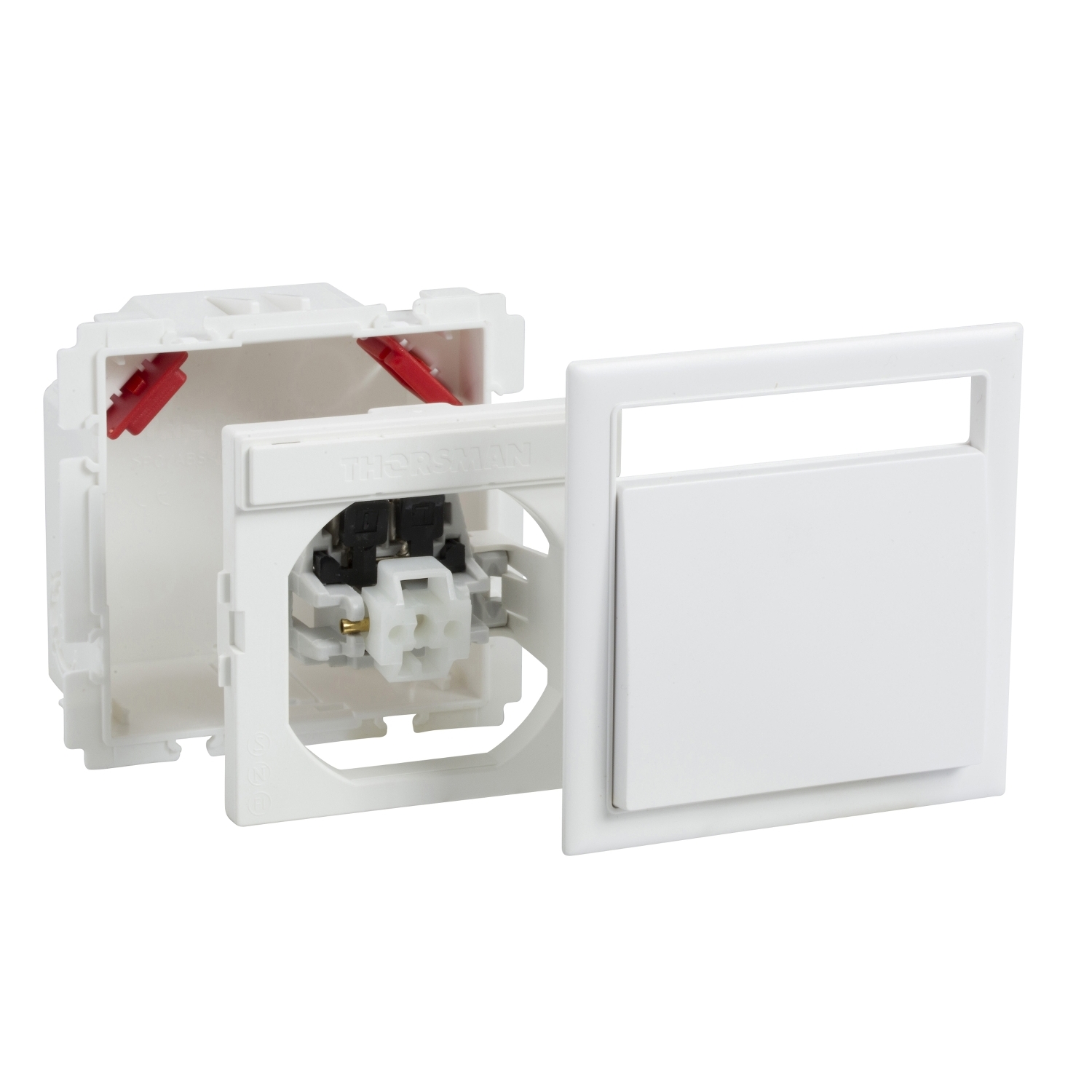 Anschusskit mit Dose Taster 1polig inkl Wippe + SF weiß RAL9016 TypCYB-PB. Schalter-Anschluss-Kit mit Dose, Schaltereinsatz, Adapter, zwei Zugentlastungsvorrichtungen, Abdeckung mit einer Wippe und Etikett mit Etikettenfenster. Einschaltposition unten oder oben. 250 V, 16 A. Material PC/ABS.