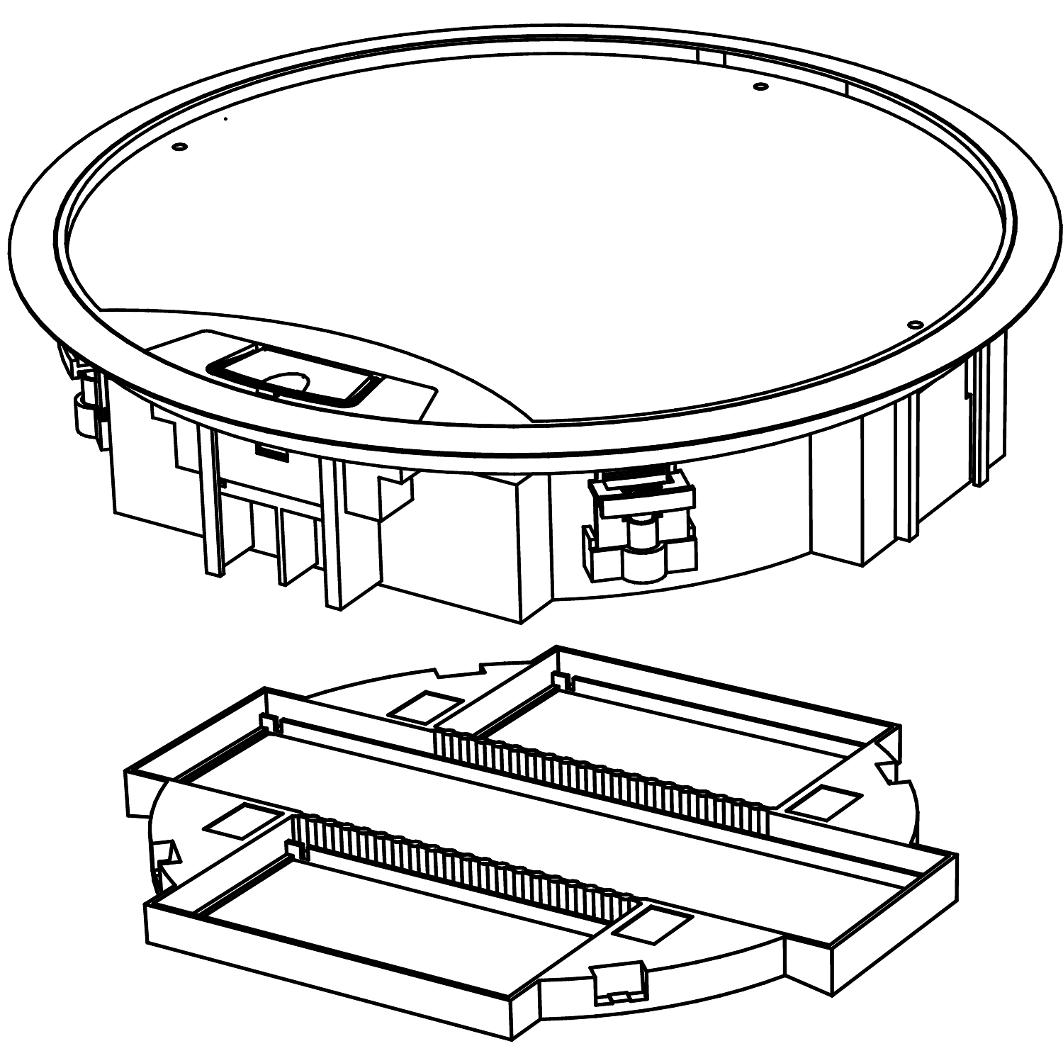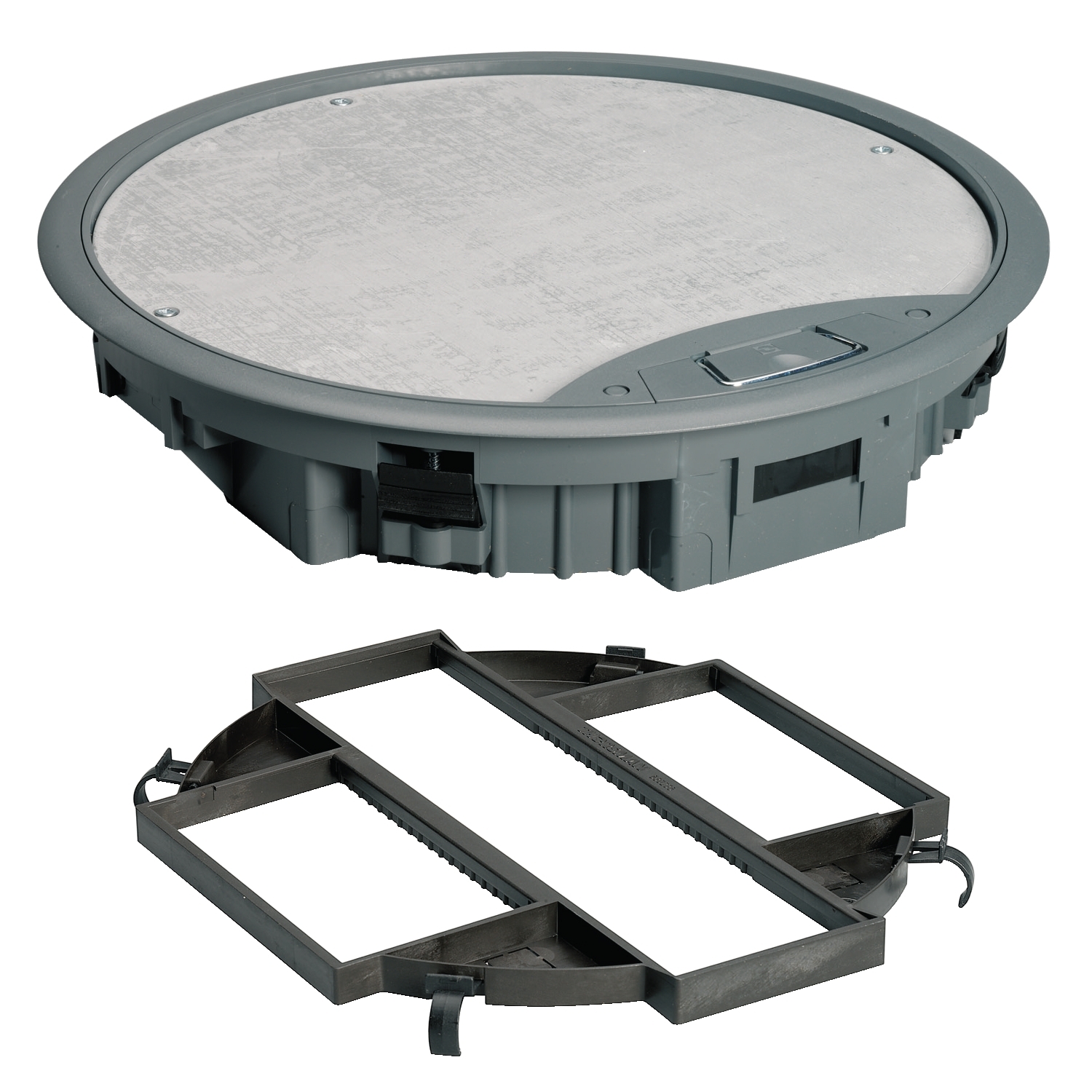 Bodentank UFB-800 antrazitgrau aehnl RAL 7016 f.Loch Durchmesser 305 mm / UFB-800-BAD 7016. Kompletter Bodentank mit Raster, Blendrahmen und Deckel. Der Deckel kann beim Einbau in vier Richtungen ausgerichtet werden. Der Raster verfügt über drei F80-Öffnungen (1 x 284 und 2 x 142) für. Strom, Telekommunikations und Datensteckdosen sowie vier 17,5 x 18,2-mm-Durchbrüche für Actassi-Modular-Steckdosen. Die Durchbrüche können auch für Rohre verwendet werden, wenn eine durchgehende Leitung durch den Tank geführt werden soll. Der Raster kann auf den Blendrahmen aufgeschnappt werden und ist in sieben Stufen von 70 mm bis 100 mm verstellbar. Blindabdeckung UFB-L142 dient der Füllung leerer Öffnungen im Raster. Geeignet für Doppelböden, Hohlraumböden und. Estrichböden mit einer Mindesthöhe von 70 mm, im letztgenannten Fall in Verbindung mit der Unterflurdose UFB-IG. Material: PA/ABS, PA6.6 mit 35 % Glasfaser, Stahlblech S 350 GD.