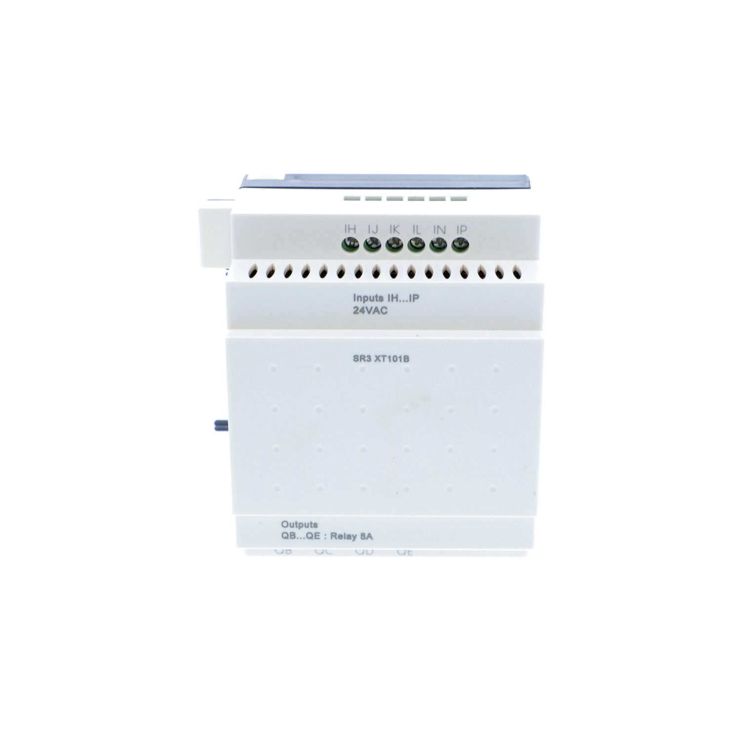 E/A-Erweiterungsmodul für modulares SPS-Steuerrelais Zelio Logic SR3. Insgesamt 10 E/A, davon 6 digitale Eingänge, 4 digitale Ausgänge. Die Spannungsversorgung erfolgt über das SPS-Steuerrelais. Die digitalen Ausgänge sind als Transistor ausgeführt. Schutzart Klemmleiste IP20, Schutzart Frontplatte IP54. Montage auf 35mm Hutschiene. Zertifiziert nach CE, cULus Listed, CSA, GL, GOST, C-Tick.
