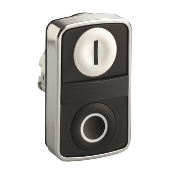 Frontelement für Doppeldrucktaster Harmony ZB4. Front weiß/schwarz, Blende Chrom-beschichtes Metall, E/A. 2 flache Drucktaster, weiß I, schwarz O. Montagedurchmesser 22 mm, Gewicht 0,056 kg. Mechanische Lebensdauer 1000000 Zyklen. Kopfform rechteckig, standard. Mit hoher Vibrationsfestigkeut und chemischer Beständigkeit, Umgebungstemperatur -40 bis +70 Grad C. Das modulare Metallprogramm mit 22mm Einbaumaß kombiniert einfache Installation, Effizienz und modernes Design. Zertifizierungen nach UL gelistet, CSA, LROS (Lloyds register of shipping), GL, RINA, DNV, BV. Produktstandards gem. UL 508, JIS C 4520, EN/IEC 60947-5-5, EN/IEC 60947-1, EN/IEC 60947-5-4, CSA C22.2 No 14, EN/IEC 60947-5-1.