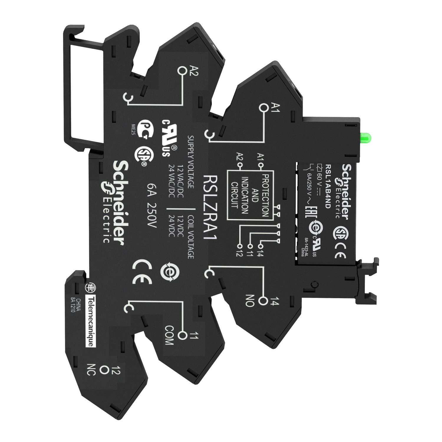 Harmony Relay. Vormontierte und direkt einsatzfähiges schmale Interface-Relais RSL. Relais mit 1 Wechslerkontakt, Standardkontakt. Steuerspannung 24 VAC/DC. Kontakt bis 6 A belastbar. Baubreite 6,2 mm. Anschlüsse Federzugklemmen, Aufnahme von Kammschienen vorhanden. LED-Anzeige, Spannungsanpassung und Schutz im Sockel integriert. Hebel zum problemlosen Einrasten und Entnahme des Relais. Aufnahme am Sockel für Beschriftungsschild. Sockel aufrastbar auf Hutschiene. Das Relais ist bereits im Sockel gesteckt und kann sofort montiert werden.