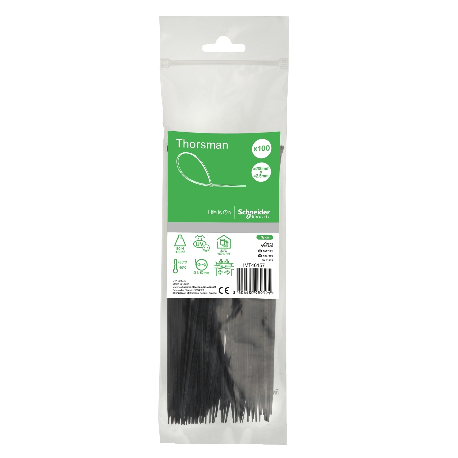 Thorsman-Kabelbinder von Schneider Electric ist 200 x 2,5 mm Kabelinstallationsmaterial. Kabelbinder werden für eine Vielzahl von Anwendungen verwendet, z.B. des Bündelns und Fixierens von Kabeln, Schläuchen und Schläuchen. Die Kabelbinder sind selbstsichernd. Die Kabelbinder haben glatte, abgerundete Kanten für eine einfache Handhabung und eine sicherere Installation. Die gebogene, abgerundete Spitze ermöglicht ein leichteres Einführen durch den Kopf des Kabelbinders. Der Bündeldurchmesser beträgt 3 mm bis 52,5 mm. Seine Schlaufenzugfestigkeit beträgt 80N / 18lbf. Die Abmessungen des Produkts betragen (L) 200 mm x (B) 2,5 mm x Dicke (T) 1,1 mm und das Produktgewicht beträgt 52 g. Es besteht aus PA (Polyamid) 6.6 UV-stabilisiert. Die Farbe des Produkts ist schwarz. Die Umgebungslufttemperatur für den Betrieb liegt zwischen -40 °C und +85 °C. Die Verpackung besteht zu 100 % aus recycelbarem Material und die Produktmenge beträgt 100 Stück in einem wiederverschließbaren Beutel mit Reißverschluss. Thorsman-Kabelzubehör wie Stecker und Hohlraumbefestigungen, Schrauben und Kabelflügel sind alle so konzipiert, dass sie maximale Ergebnisse liefern. Das Thorsman-Sortiment an Kabelgarnituren und -befestigungen bietet ein breites Angebot für alle Arten von Kundenbedürfnissen und deckt eine maximale Anzahl von Anwendungen, Flexibilität, Zuverlässigkeit und Leistung ab. Das Produkt entspricht der Norm IEC 60695-11-5 und ist feuerbeständig und verfügt über die Flammschutznorm UL 94 V2 (selbstverlöschend).