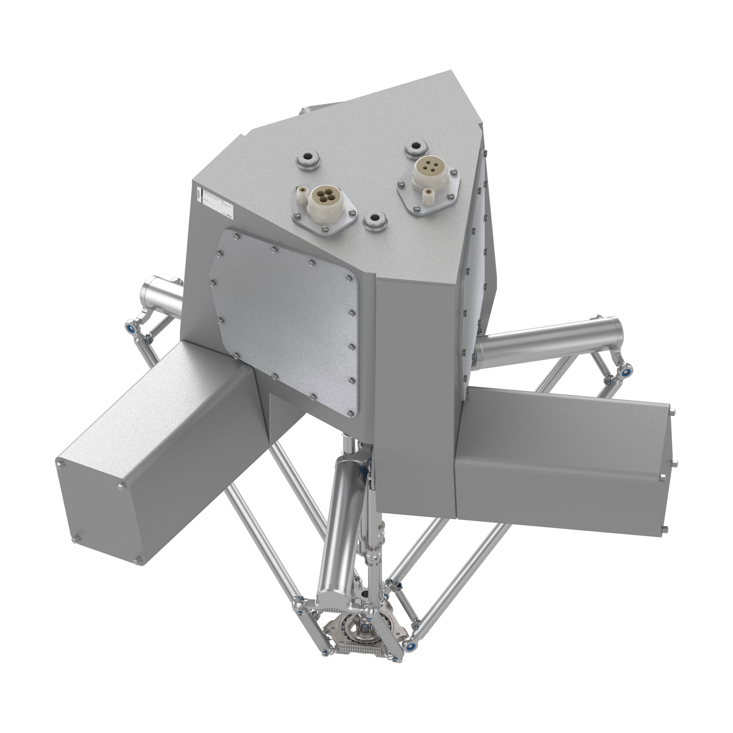 Lexium P - Roboter PacDrive Delta 3. Delta-Roboter für Pick amp; Place-Lösungen. Lexium P2 Roboter mit SH3 Motoren und rotationsachse installiert. Reichweite bis 800 mm und Traglast bis zu 15 kg. Standardgehäuse und abwaschbar.