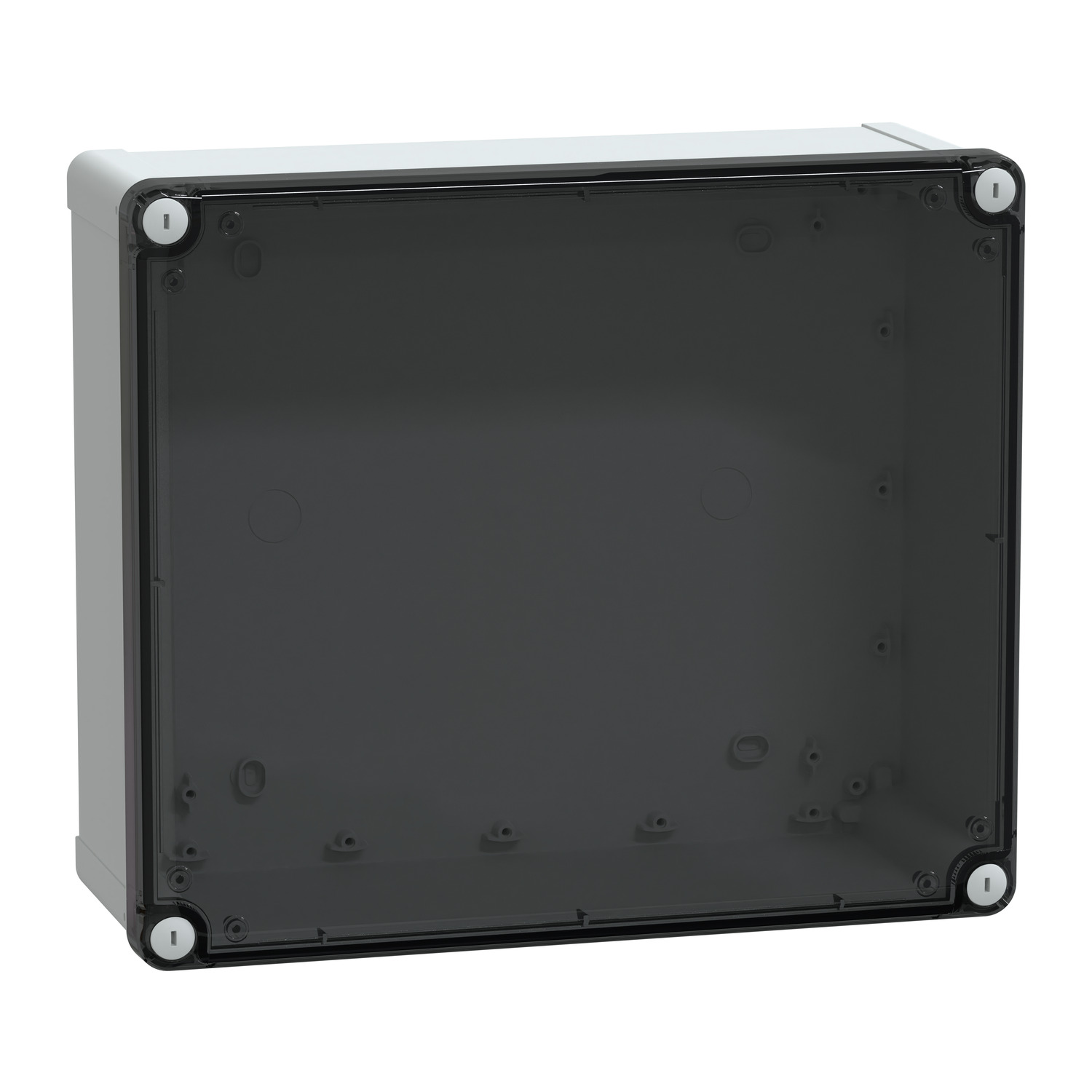 PanelSeT TBP Industrie-PC-Box mit transparentem Deckel H20. Int 325 x 275 x 120 mm. Ext 341 x 291 x 128 mm. Wandmontagegehäuse mit flachem, transparentem Deckel. Schraubenverriegelung mit unverlierbaren Kunststoffschrauben (Schlitz). Zertifizierungen DEMKO, SEMKO, TÜV, UL. UL 508 A Standard. Feuerbeständigkeit 960°. Polycarbonat, Umgebungstemperatur für Lagerung/Betrieb (-15 bis 60 °C)/(-25 bis 80 °C). IP66 (NEMA 4.4X), IK08, Grau RAL 7035, Isolationsklasse II. Verpackungseinheit 5 Stk.