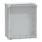 PanelSeT TBP Industrie-PC-Box mit transparentem Deckel H60. Int 325 x 275 x 160 mm. Ext 341 x 291 x 168 mm. Wandmontagegehäuse mit hohem transparentem Deckel. Schraubenverriegelung mit unverlierbaren Kunststoffschrauben (Schlitz). Zertifizierungen DEMKO, SEMKO, TÜV, UL. UL 508 A Standard. Feuerbeständigkeit 960°. Polycarbonat, Umgebungstemperatur für Lagerung/Betrieb (-15 bis 60 °C)/(-25 bis 80 °C). IP66 (NEMA 4.4X), IK08, Grau RAL 7035, Isolationsklasse II. Verpackungseinheit 5 Stk.