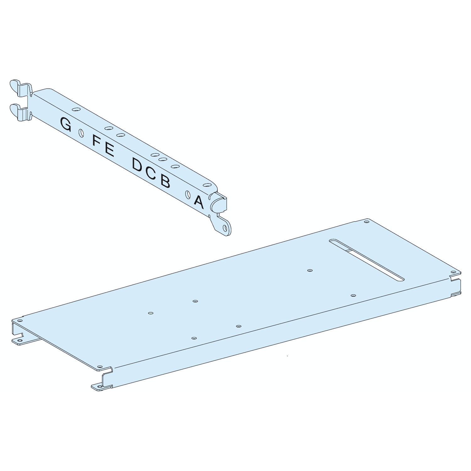 PrismaSeT P. Montageplatte für einen 3- oder 4-poligen MasterPacT MTZ1 06-16 in vertikaler Einbaulage in Einschubtechnik. oder für einen 3- oder 4-poligen ComPacT NS630b-1600 A mit Kipphebelantrieb, Drehantrieb oder Motorantrieb in vertikaler Einbaulage in Einschubtechnik, mit einer Höhe von 8 Moduleinheiten für Schaltschränke mit einer Breite von 650 mm. Pulverbeschichtet in RAL9003 struktur.