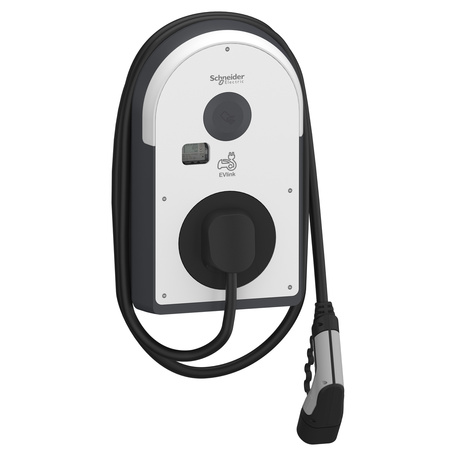 EVlink Pro AC Wallbox in eichrechtskonformer Ausführung mit Typ 2 Ladekabel 5m mit Shuttern. Für den Einsatz in öffentlichen Garagen oder auf Parkplätzen, für die Innen- oder Außeninstallation an der Wand, auf der EVlink Stele (EVA1PBS1 / EVA1PBS2) oder im Metal Kit (EVA1RWKS1 / EVA1RFKS1 / EVA1RFKS2). Mode 3 Ladung gemäß IEC 61851-1, 3-phasig mit maximal 22 kW Ladeleistung, Typ 2 Ladekabel mit 5m Länge. mit integriertem eichrechtskonformen Zähler, 6mA Gleichfehlerstromerkennung (ermöglicht den Einsatz eines FI Typ A). Digitaleingänge: 1 für vorübergehende Strombegrenzung, 1 für verschobene/ausgesetzte Ladung, 1 für EV-Anwesenheitserkennung. Zugriffskontroller über NFC / RFID Reader. NFC Reader 13,56 MHz kompatibel mit Typ 1, 2, 4 und 5 Badges, RFID Reader: Entspricht den Protokollen ISO/CEI 14443 A & B und ISO/CEI 15693, Kompatibel mit Mifare Ultralight, Mifare Classic, Mifare Plus. Nutzerinformationen und Statusmeldung über einen gut sichtbaren LED-Bogen, inbetriebnahme der Wallbox über eSetup App via Bluetooth. Kommunikationsstandards: Bluetooth, Ethernet 2 Anschlüsse (1 für Daisy Chain), Modbus serial, Modbus TCP, OCPP 1.6J zur Anbindung an ein Backend sowie dem Lastmanagementsystem EcoStruxure EV Charging Expert. optionales Zubehör: Wifi Modul (EVA1MW), Modem Modul (EVA1MS & EVA1MM), ISO 15118 Modul (EVA1M8), steckbar auf den Ladecontroller. Farbe der Ladestation: Korpus: Dunkelgrau RAL 7016 und Schwarz RAL 9005, Frontabdeckung: Weiß RAL 9003. Abmessungen BxHxT: 317x529x153mm, Gewicht: 7,5 kg, Material: Polycarbonat UV-behandelt. Stoßfestigkeit IK10, Schutzgrad IP55, Betriebstemperatur -25 bis 40°C, Lagertemperatur -40 bis 80°C, Betriebshöhe max. 2000m ohne Derating, rel. Luftfeuchte 5 bis 95%, Eigenverbrauch