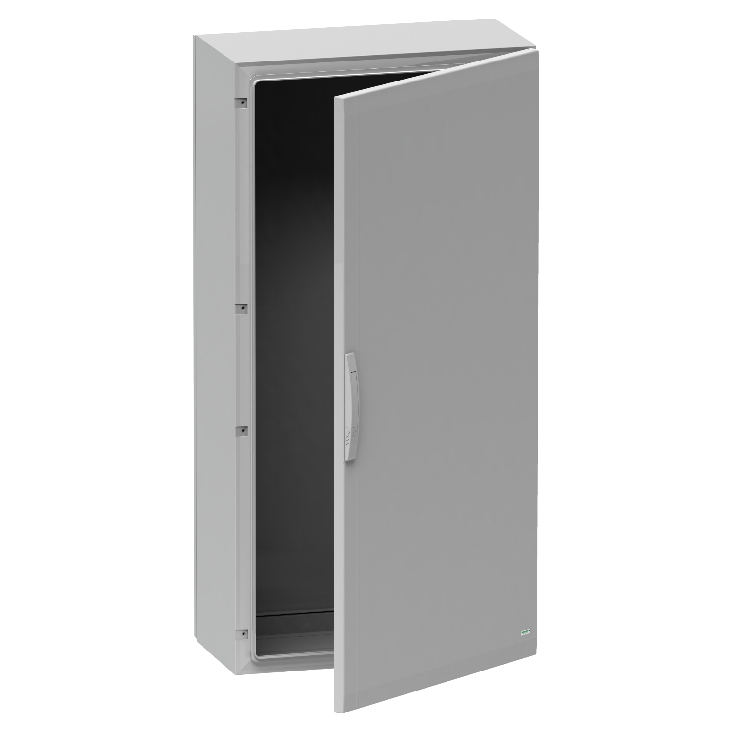 PanelSeT PLA Standgehäuse aus Polyester, vollständig abgedichtet, Version PLA. Versiegeltes Ober- und Unterteil, mit Seitenteilen montiert. 4-Punkt-Türverriegelung mit 5-mm-Doppelstangenschlössern. 1 Tür Typ transparente Front. Polyester verstärkt mit Glasfaserkörper. Schutzart IP 65, IK08, Grau RAL 7035.