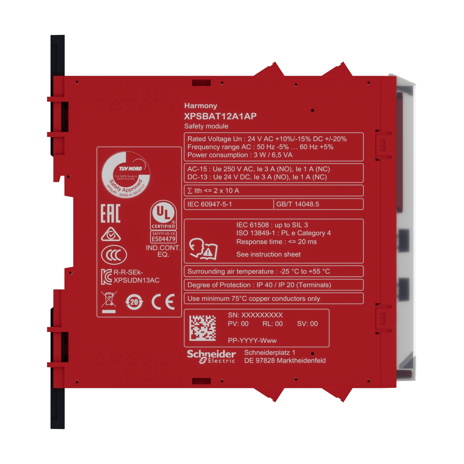 Die Sicherheitsrelais Harmony XPS Basic realisieren grundlegende Sicherheitsfunktionen. Mit diesem Sicherheitsbaustein lassen sich klassische Sicherheitsanwendungen mit einer Abschaltverzögerung realisieren. An den frontseitigen Drehschaltern läßt sich die Abschaltverzögerungszeit und eine der beiden Sicherheitsfunktionen einstellen. An den Eingängen können mechanische Öffner-Kontakte von Not-Aus/Halt-Tastern, Positions-, Magnet-, Seilzugschaltern, sowie Lichtvorhänge oder RFID-Sicherheitsschalter mit OSSD-Ausgängen angeschlossen werden. Eine Sicherheitsfunktion kann über die beiden Eingänge in zweikanaliger (redundanter) Ausführung betrieben werden. Für die Startfunktion stehen der automatische, manuelle oder überwachte Start an separaten Eingängen zur Verfügung. Dieses Sicherheitsschaltgerät verfügt am Ausgang über 2 sichere unverzögerte Relais-Schließerkontakte, 1 abschaltverzögerten sicheren Schließerkontakt und 1 Halbleiter-Meldeausgang. Die Abschaltverzögerung (z. B. Stopp-Kategorie 1 oder 2, SS1 oder SS2) läßt sich von 0,1 Sekunde bis 15 Minuten gestuft einstellen. Die Versorgungsspannung beträgt 24 VAC/DC und die Anschlüsse erfolgen über abziehbare Schraubklemmen. Anwendung bis zum Sicherheitsniveau PL e in Kategorie 4 oder SIL3 lassen sich realisieren. Vielfältige Zulassungen ermöglichen den internationalen Einsatz. Die Montage erfolgt durch aufrasten auf Hutschiene oder per Schraubbefestigung auf Montageplatten. Zum Schutz der Einstellungen unter der transparenten Abdeckung ist ein eindeutig nummeriertes Verriegelungsband beigefügt.