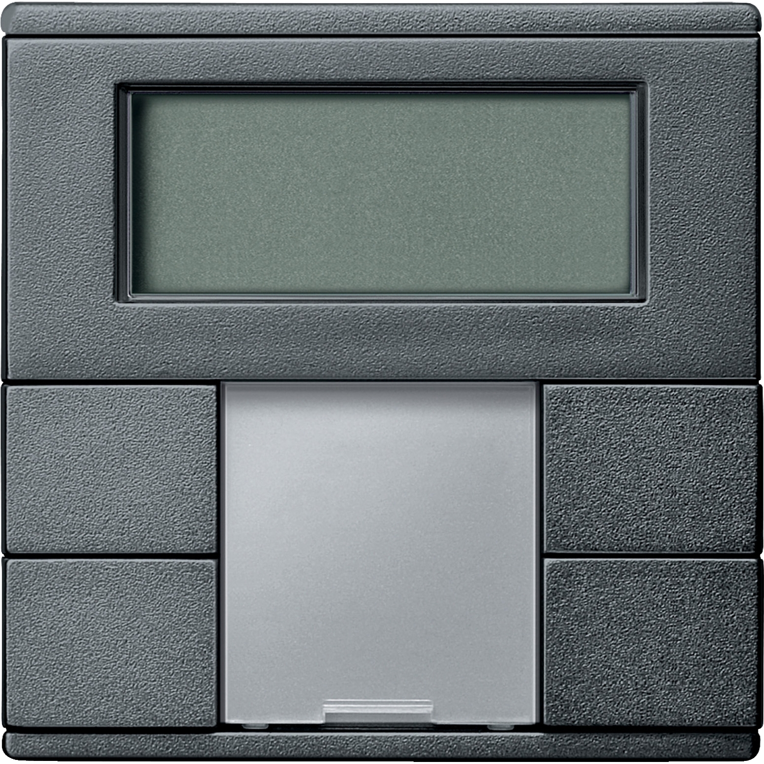 Tastsensor 2fach plus mit Raumtemperaturregler. Für System M. Komfortable Bedieneinheit mit 4 Bedientasten, Betriebs- und Statusanzeige und Beschriftungsfeld. Die Betriebsanzeige kann auch als Orientierungslicht verwendet werden. Mit Raumtemperaturregler und Display. Mit 5 roten LEDs. Der Raumtemperaturregler kann zum Heizen und Kühlen mit stufenlos einstellbaren KNX-Ventilantrieben oder zur Ansteuerung von Schaltaktoren und Heizungsaktoren verwendet werden. Mit dem weiß hinterleuchteten Display zur Anzeige von z.B. Uhrzeit, Datum, Temperatur und Betriebsart. Menü zur Einstellung von Standardbetriebsarten, Sollwert, Arbeits-/Nichtarbeitstag (externer Trigger), Anzeigemodus, Uhrzeit, Schaltzeiten und Helligkeit des Displays. Die Taster sind als Tasterpaare (Zweiflächen) oder als Einzeltaster frei parametrierbar. Mit integriertem Busankoppler. Der Busanschluss erfolgt über eine Busanschlussklemme. Funktionen der Drucktasten: Schalten, Umschalten, Dimmen, Jalousiesteuerung (relativ oder absolut), Impulsflanken lösen 1-, 2-, 4- oder 8-Bit-Telegramme aus (Unterscheidung zwischen kurzer und langer Betätigung). Impulsflanken mit 2-Byte-Telegrammen (Unterscheidung zwischen Kurz- und Langbetrieb), 8-Bit-Linearregler, Szenenabruf, Szenenspeicherung, Sperrfunktionen. Zeitsteuerung mit Synchronisation, Benachrichtigungsfunktionen, zyklisches Einlesen von externen Temperaturwerten, Lüftersteuerung, Betriebsarten, Sollwertverschiebung. Funktionen des Raumtemperaturreglers: Reglerart: 2-Punkt-Regelung, stetiger PI-Regler, schaltender PI-Regler (PWM). Ausgang: kontinuierlich im Bereich 0 bis 100% oder schaltend ON/OFF. Betriebsart Regler: Heizen mit einem Reglerausgang. Kühlen mit einem Reglerausgang. Heizen und Kühlen mit getrennten Reglerausgängen. Heizen und Kühlen mit einem Reglerausgang. 2-stufiges Heizen mit 2 Regelausgängen. 2-stufiges Kühlen mit 2 Regelausgängen. 2-stufiges Heizen und Kühlen mit 4 Regelausgängen. Betriebsarten: Komfort, Komfortverlängerung, Standby, Nachtabsenkung, Frost-/Hitzeschutz. Verschieben aller Sollwerte, Speichern aller Solltemperaturen und Betriebsarten bei Reset, externe Temperaturüberwachung, zusätzliche Ausgabe der Stellgröße als 1 Byte Wert auf der PWM. Mit Busanschlussklemme und Trägerplatte. Schraube für Demontageschutz. Mit Schutzhaube für Gips. Material: Thermoplast edel matt. Farbe: anthrazit.
