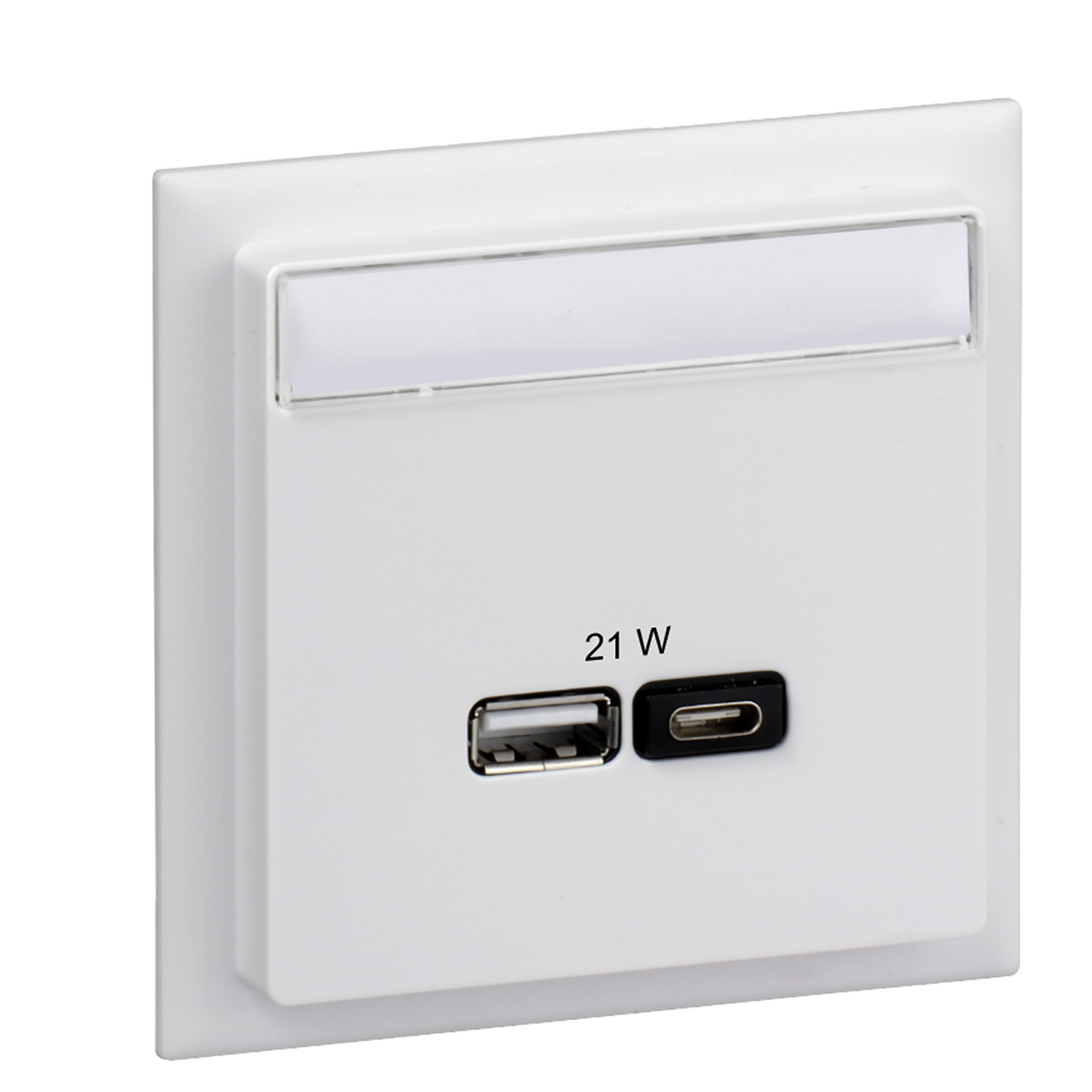 USB Ladestation A+C 2 Ausg. max. 2,4A Abdeckung Schriftfeld weiß TYPCYB USB A+C. USB-Ladeanschluss-Kit mit Dose, USB-Einsatz, Adapter, zwei Zugentlastungsvorrichtungen, Abdeckung und Etikett mit Etikettenfenster. Die maximale Stromstärke beträgt 2,4 A, wenn nur ein Ausgang genutzt wird, bei Nutzung beider Ausgänge ist die maximale Stromstärke aufzuteilen. Eingangsnennspannung 100-240 V AC. Ausgangsspannung USB 5 V DC. Material PC/ABS.