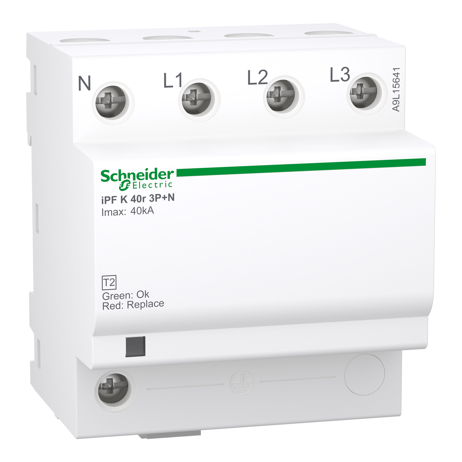 Überspannungsableiter Typ 2 iPF K 40, 3-polig + N. Imax 40kA. In 15kA. Netzform TT&TN-S. Up=1,5kV. Ue 230/400VAC (+/- 10%). frontseitige Statusanzeige für Betriebszustand. Breite 4TE. entspricht IEC 61643-11: 2011. mit Fernmeldekontakt.