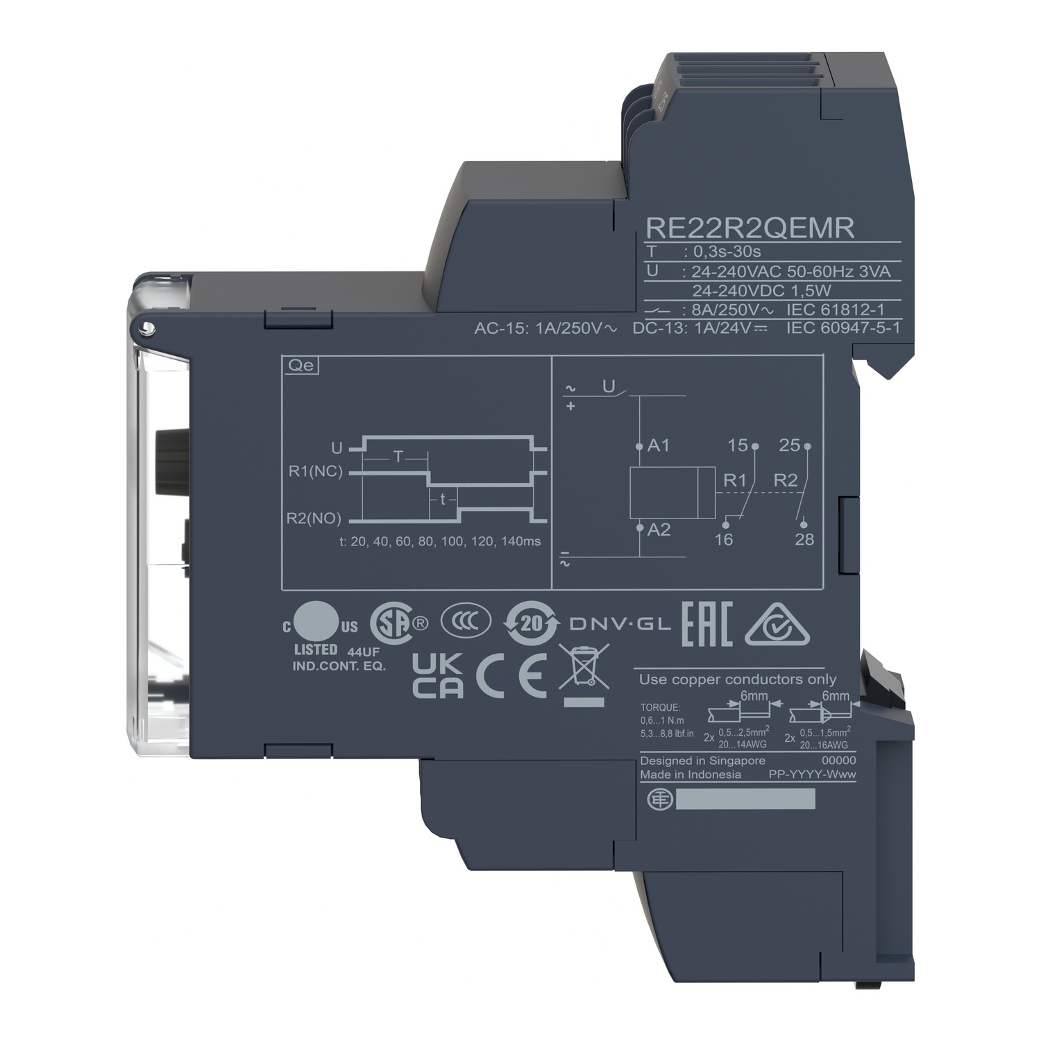 Harmony Time. Elektronisches Zeitrelais zur Steuerung von Automatisierungsanwendungen in Baubreite 22,5 mm zur Montage auf der Hutschiene. Es verfügt über die Zeitfunktion Stern-Dreieck-Anlauf mit Ansprechverzögerung. Der Zeitbereich umfasst 0,3 - 30 s. Am Ausgang schalten ein Relais-Schließer und ein Relais-Öffner, die jeweils bis zu 8 A belastbar sind. Die Einstellungen erfolgen über Bedienelement in der Front, die unter einer Klarsichtabdeckung gegen Veränderungen geschützt werden können. Mit einem beleuchteten Skalenpfeil läßt sich die Einstellung der Potentiometer sehr deutlich auch aus der Entfernung erkennen. LED-Anzeigen informieren über den Zustand. Das Weitspannungsnetzteil (24-240 VAC/DC) ermöglicht einen universellen Einsatz. Der Leitungsanschluss erfolgt über Schraubklemmen.