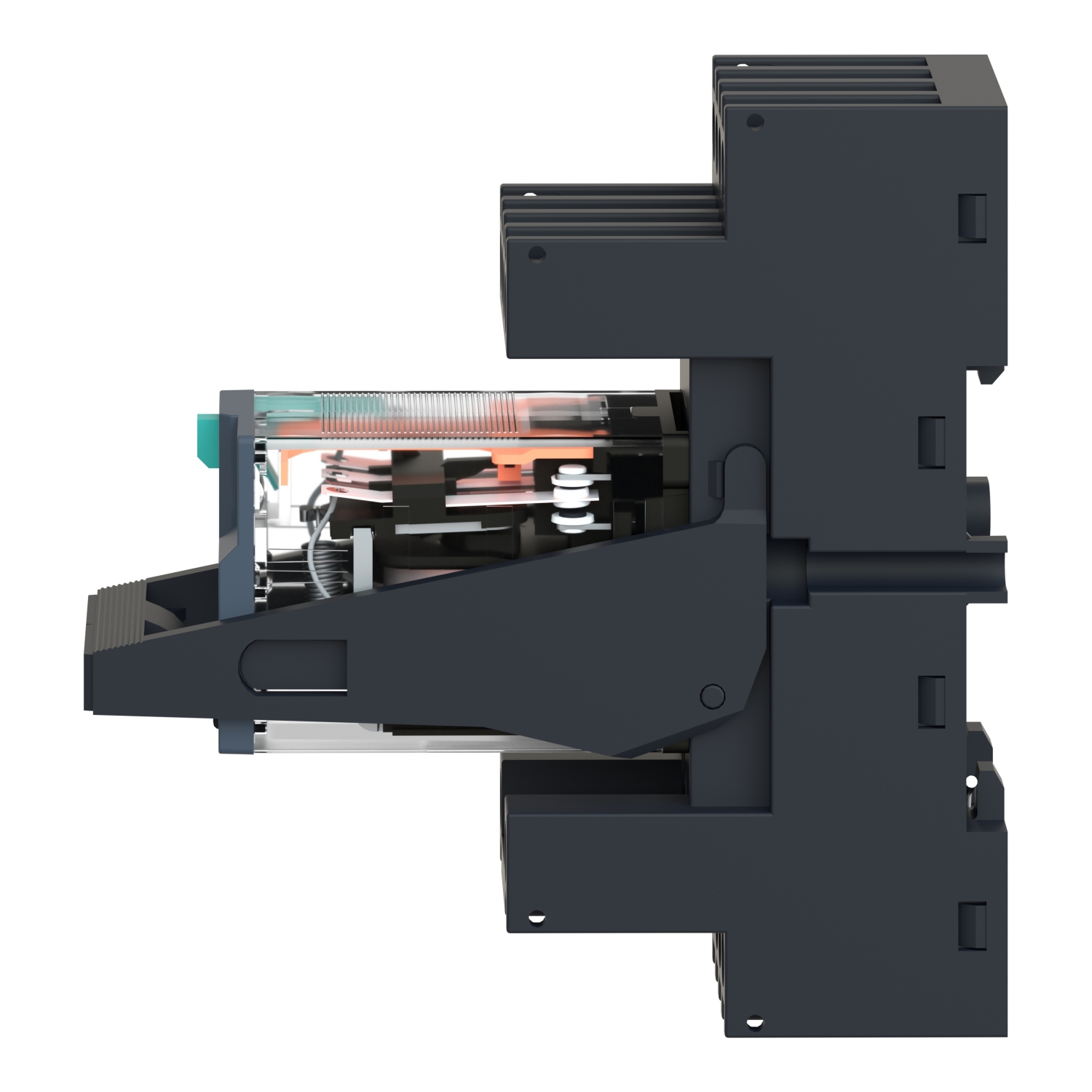 Harmony Relay. Vormontiertes und direkt einsetzbares Miniaturrelais RXM bestehend aus Relais, Sockel, Haltebügel und Beschriftungsschild. Anzahl Kontakte- 4, Ausführung- Relaiswechsler, Kontaktbelastbarkeit- je 6 A. Spulen-Steuerspannung- 24 VDC. Mechanische Stellungsanzeige- ja, LED-Anzeige- nein. Prüftaste zum Testen der Kontakte- ja, Prüfhebel zur dauerhaften Umschaltung für Testzwecke- ja, Bedienung- werkzeuglos. Stecksockel mit Schraubklemmen in kombinierter Anordnung zur Montage auf Hutschiene oder aufschraubbar auf Montageplatte. Kunststoffhaltebügel zur Fixierung und einfachen Entnahme des Relais. Beschriftungsschild zur Kennzeichnung. Alle Komponenten sind einsatzfertig montiert und das vormontierte Relais kann sofort eingesetzt werden.