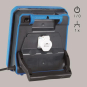 Mobile Arbeitsleuchte. Schlag- und bruchfestes 2-Komponenten-Kunststoff-Gehäuse. Kantenschutz und Griff mit weichem Kunststoff (thermoplastisches Elastomer - TPE). Abdeckung opal, aus schlag- und bruchfestem Kunststoff (Polycarbonat). Homogene, weiche und blendreduzierte Ausleuchtung durch Multi-LED-Technologie, opaler Abdeckscheibe und großer Lichtaustrittsfläche. Lichtrichtungsabgabe einstellbar mit Bügel aus Kunststoff (ABS). Eine Steckdose auf der Rückseite ermöglicht den Anschluss weiterer Leuchten oder elektrischer Geräte. Ergonomisch platzierter Schalter. Schwere Gummischlauchzuleitung H07RN-F für hohe mechanische Belastungen mit Netzstecker. Umfangreiches Zubehör optional erhältlich (Stative, Halteschienen, Magnethalter, etc.). Leuchte mit begrenzter Oberflächentemperatur nach DIN EN 60598-2-24.