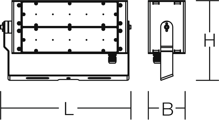 LED-Strahler. Gehäuse aus Aluminium, pulverbeschichtet. Haltebügel aus rostfreiem Stahl, pulverbeschichtet. Hocheffiziente LED-Einheiten mit optimaler Lichtlenkung durch präzise Linsenoptik aus Kunststoff (PC) klar. Lichtrichtung feinstufig einstellbar.