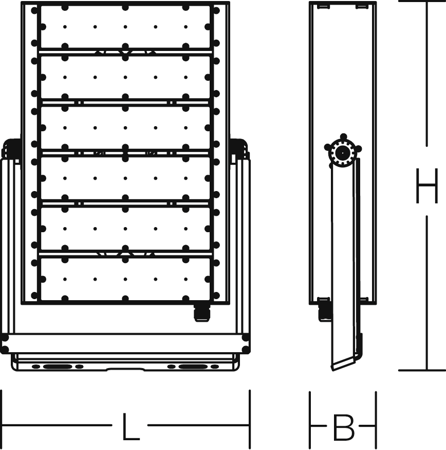 LED-Strahler. Gehäuse aus Aluminium, pulverbeschichtet. Haltebügel aus rostfreiem Stahl, pulverbeschichtet. Hocheffiziente LED-Einheiten mit optimaler Lichtlenkung durch präzise Linsenoptik aus Kunststoff (PC) klar. Lichtrichtung feinstufig einstellbar.