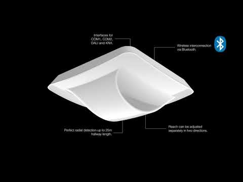 Der klügere Gangsensor weiß mehr. Perfekte radiale Erfassung bis 25 m - ideal für lange Gänge und Flure. Reichweite in beide Richtungen anpassbar. Zeitgemäßes True Presence®-Design. Ausgestattet mit Bluetooth-Technologie. Schnittstellen für COM1, COM2, DALI-2 APC, DALI-2 IPD, IP, KNX und BT IPD (Slave).