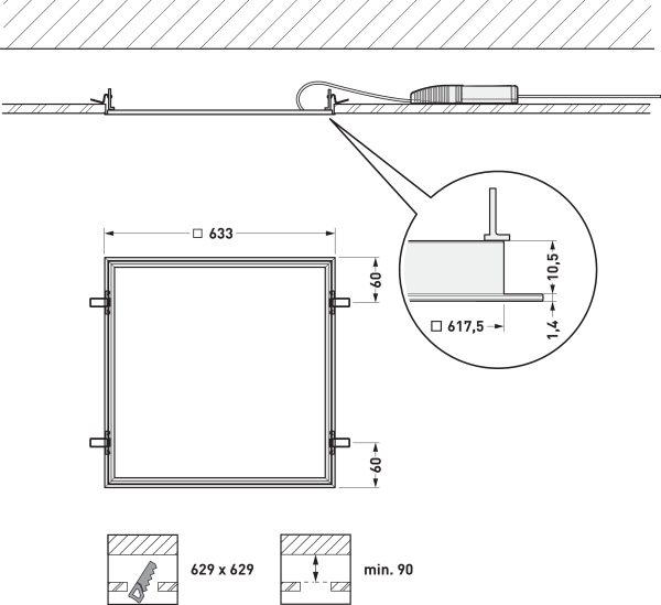 Einbaurahmen für gesägte Deckenausschnitte. Die Befestigung erfolgt mittels Federklemmen. Das Befestigungszubehör ist im Lieferumfang enthalten. Farbe weiß (ähnlich RAL 9016). Maße (L x B x H): 625 mm x 625 mm x 25 mm.