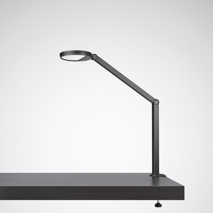 Kompakte Tischleuchte mit einem flachen, runden Leuchtenkopf, drei Justiergelenken und Befestigungsklemme. Die Steuerung der Leuchte erfolgt über die Bedienelemente am Leuchtenkopf.