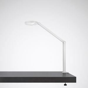 Kompakte Tischleuchte mit einem flachen, runden Leuchtenkopf, drei Justiergelenken und Befestigungsklemme. Die Steuerung der Leuchte erfolgt über die Bedienelemente am Leuchtenkopf.