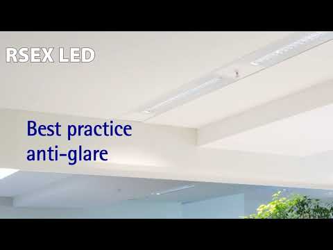 Stahlblechgehäuse geeignet für Decken mit sichtbaren T-Schienen, verdeckt symmetrischen Schienenkonstruktionen und ausgeschnittene Decken, Lichtverteilung direkt strahlend mittels MIRO® Parabolraster seidenmatt aus Aluminium, reflexionsverstärktem, selbstrastend, beidseitig abklappbar. Geeignet für Bildschirmarbeitsplätze, rundumentblendet 65°
